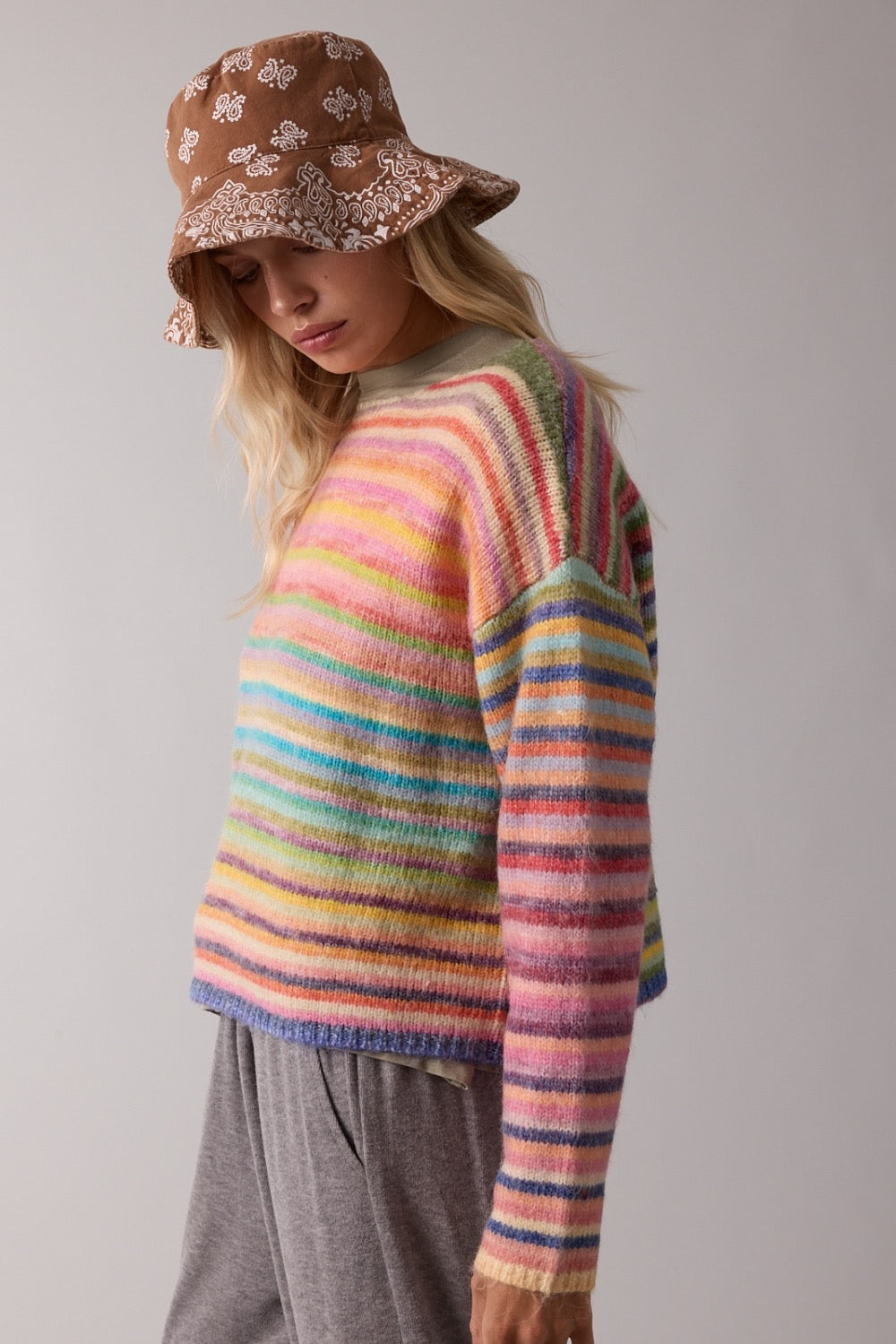 Long-sleeve comfy sweater in multi rainbow hues to match everything in your closet! A perfect weight for all seasons.